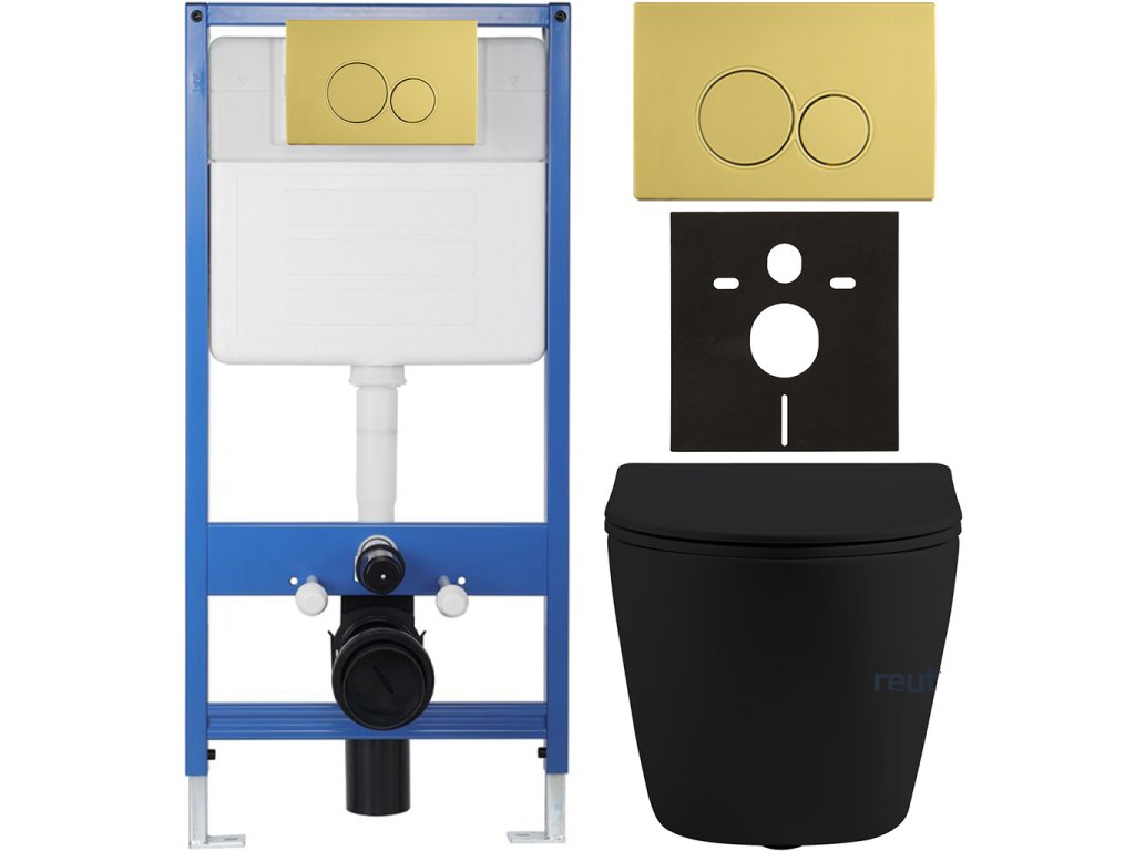 CERANO - Kompletný podomietkový WC set Lite/Cesso - čierna matná - WC tlačidlo Duo. zlatá - predstenová inštalácia - 49x36 cm CER-8050BD84355