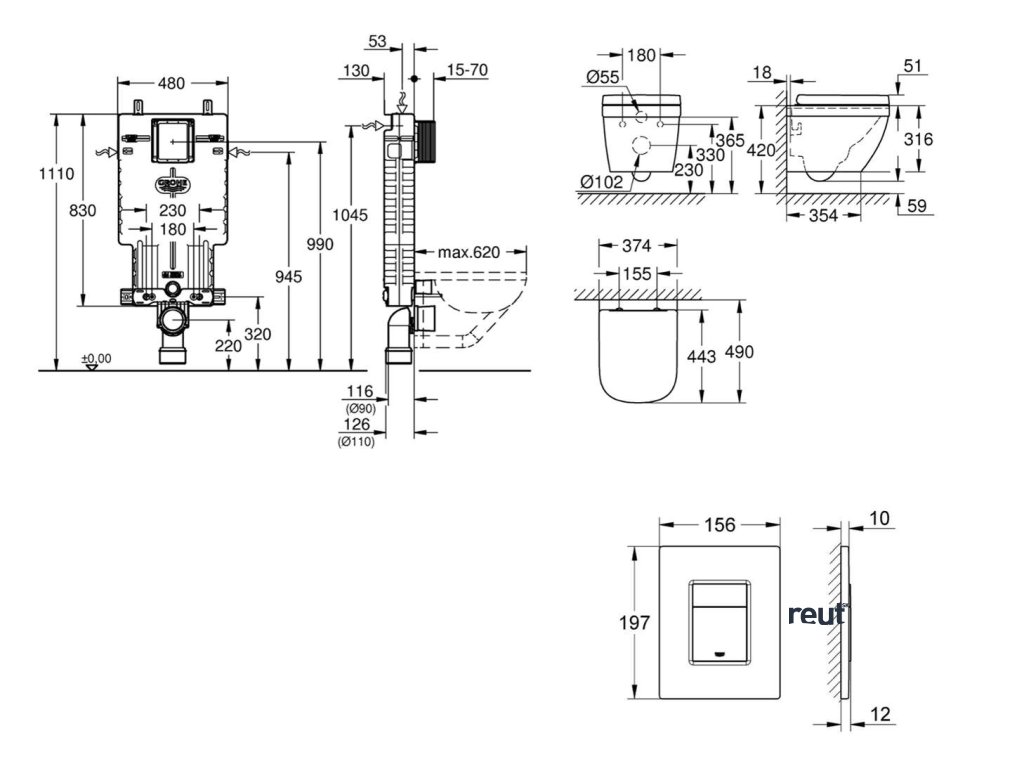 Grohe Uniset Set predstenovej inštalácie, klozetu, dosky SoftClose a tlačidla Skate Cosmopolitan, Triple Vortex, alpská biela SANI15BB3105-GR