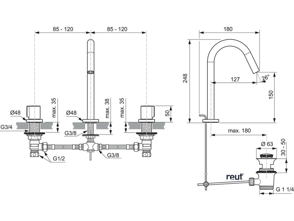 Ideal Standard Joy Umývadlová batéria, 3-otvorová inštalácia, s výpustom, Magnetic Grey BC783A5