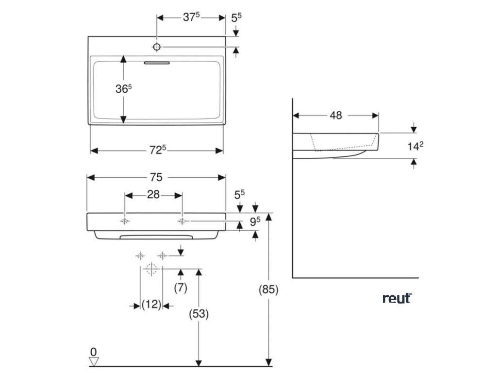 Geberit ONE Umývadlo, 75x48x14 cm, skrytý prepad, s otvorom na batériu, vodorovný odtok, KeraTect, biela 505.036.00.1