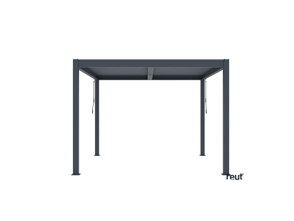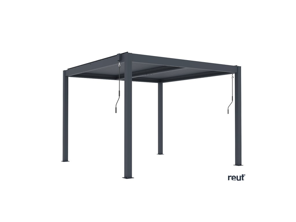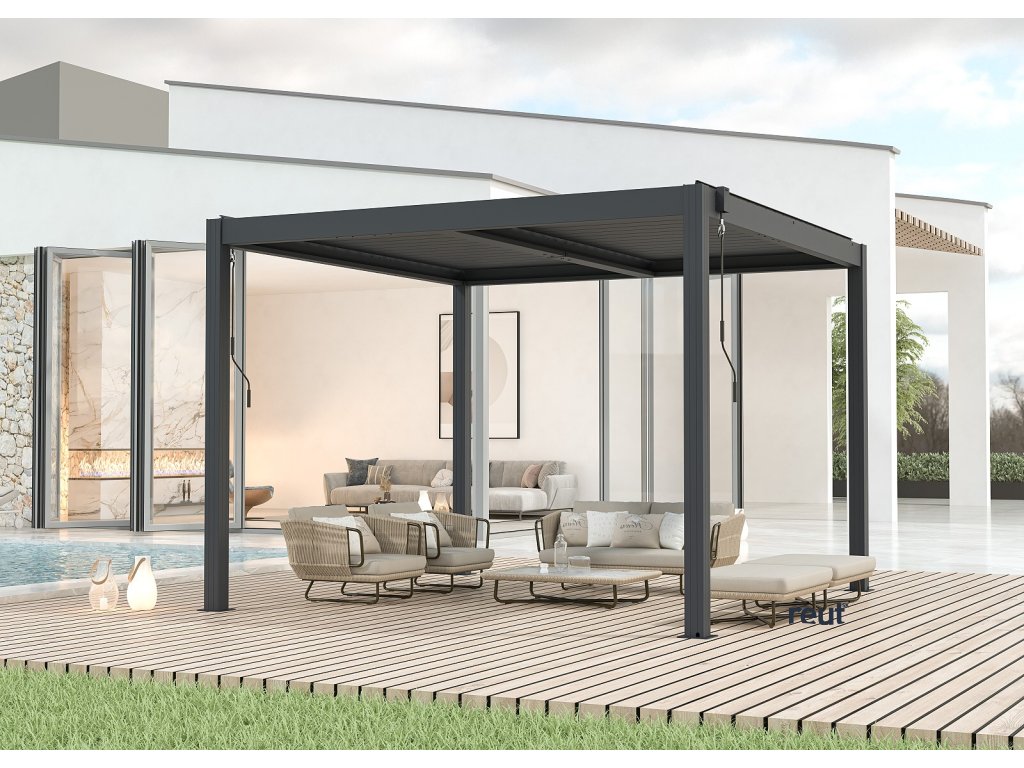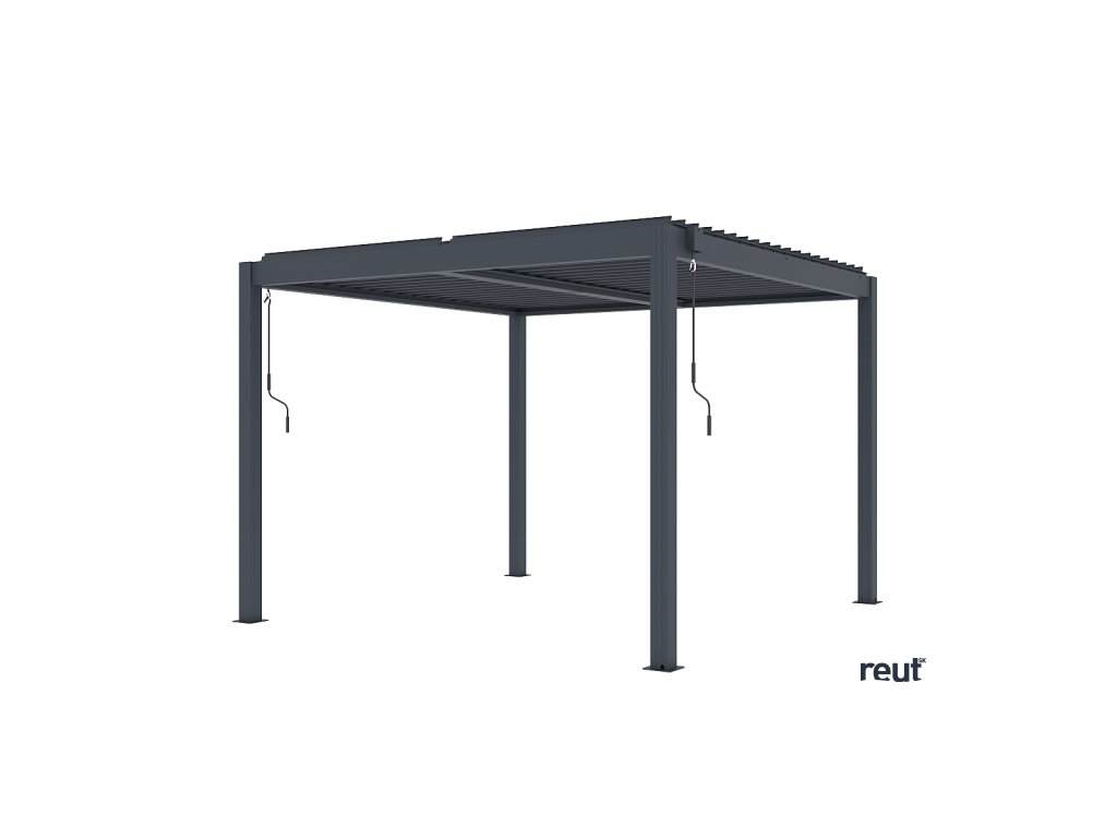 Základná verzia bioklimatickej pergoly LANITPLAST BIOCLIMATIC BASIC s vodorovnou lamelovou strechou a manuálnym ovládaním strešných lamiel. Ide o základnú verziu pergoly, ktorá má konštrukciu z hliníka a strechu zloženú z desiatok otočných oceľových lamiel. Lamely je možné manuálne kľukou otáčať v uhle 0 až 110°. Malá ručná kľučka ovláda mechanizmus strechy, pričom jej otáčaním umožňujete plynulé a synchronizované nastavenie lamiel. Každú stranu pergoly je možné ovládať samostatne, čo umožňuje individuálne nastavenie strešných lamiel podľa potreby v závislosti od uhla dopadajúceho slnečného svetla. Uhol natočenia 90° zaistí otvorenú strechu a uhol 0o uzavretú strechu. Konštrukcia pergoly je vyrobená z odolnej hliníkovej zliatiny a je nastriekaná práškovou vypaľovanou farbou komaxit odtieň antracit, a preto perfektne odoláva prírodným klimatickým vplyvom. Strešné lamely sú vyrobené z oceľového profilu ošetreného vypaľovanou farbou komaxit v rovnakom odtieni antracit.