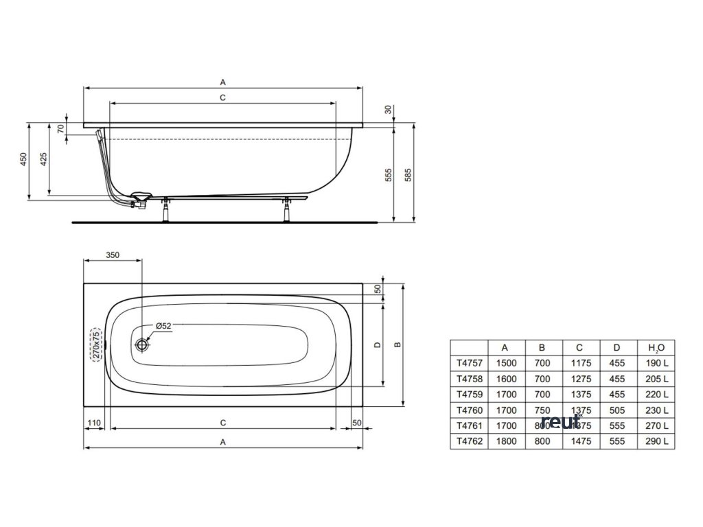 Nožičky a odtoková súprava nie sú súčasťou dodávky.