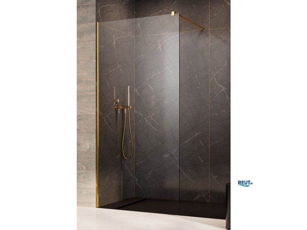 Walk-in sprchový kút Modo New Gold II pozostáva z pevného skla, stenového profilu a stenovej rozpernej tyče.